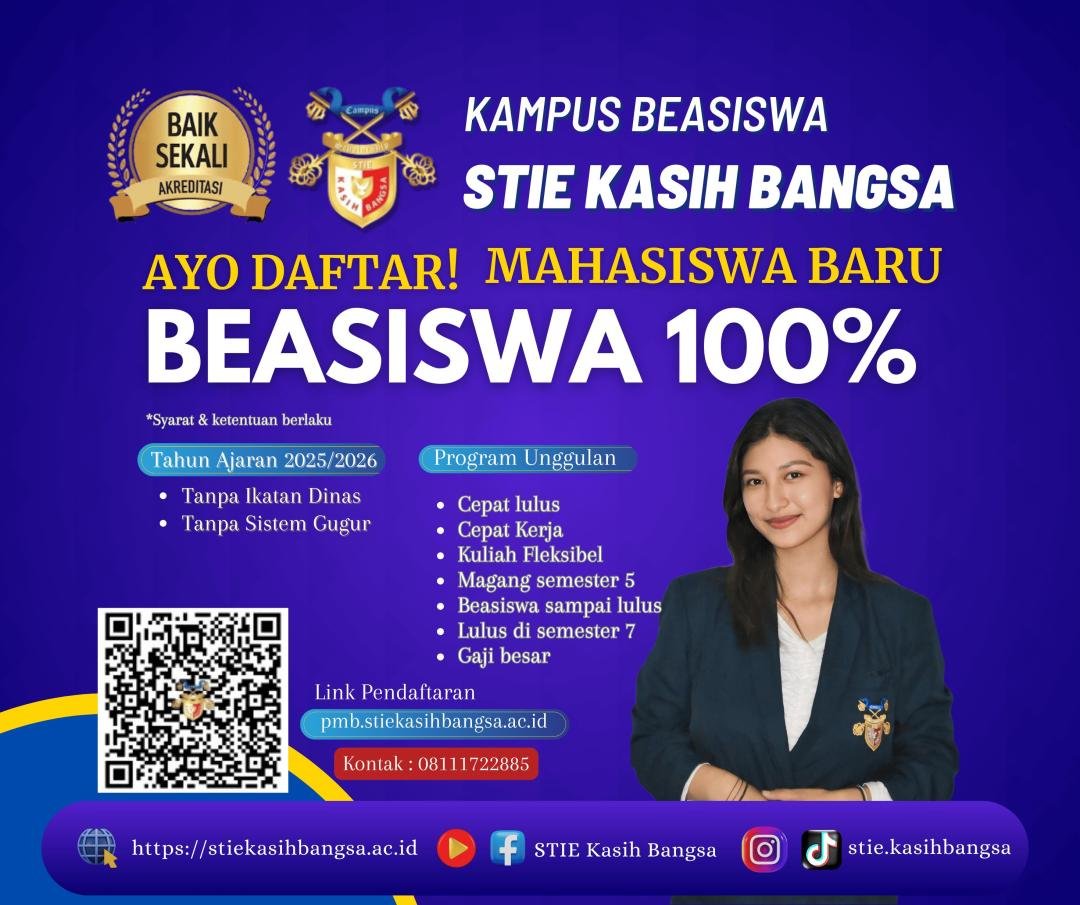 Kampus Beasiswa STIE Kasih Bangsa terus memberikan kejutan dan kado istimewa kepada calon mahasiswa/i yang baru lulus SMA/K, para karyawan swasta, BUMN, anggota TNI/POLRI, para guru dan kepala sekolah, para wartawan untuk mendapatkan beasiswa 100% biaya UKT sampai tamat sarjana tanpa perlu ikatan dinas apa pun.