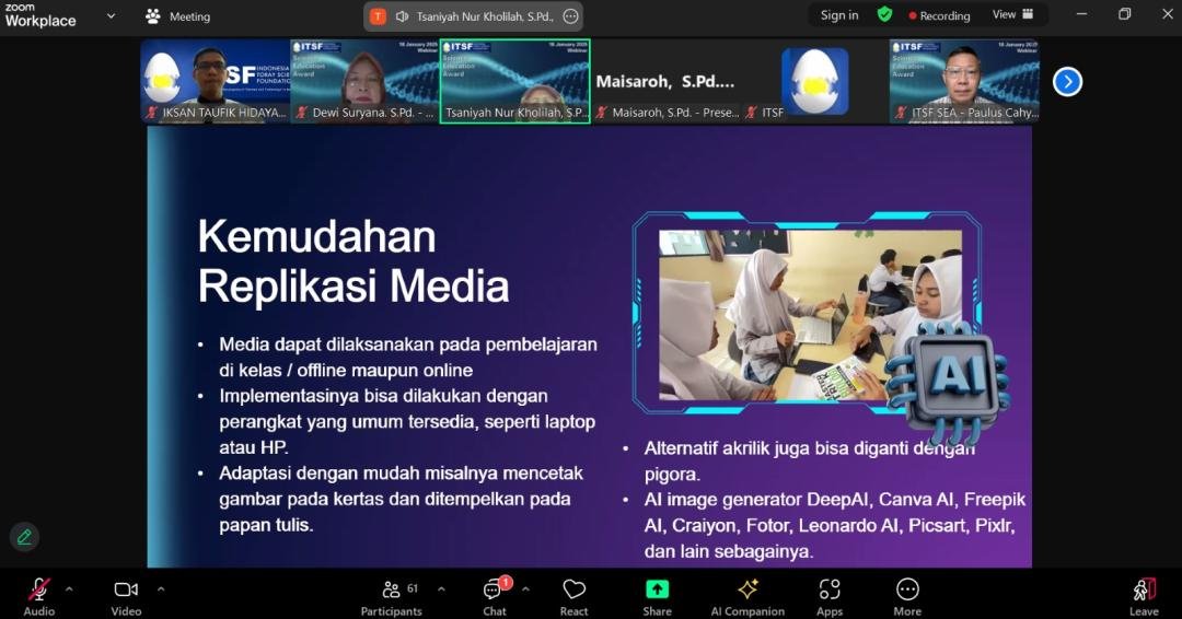 Bantul (MAN 2 Bantul) – Iksan Taufik Hidayanto, guru Fisika MAN 2 Bantul, mengikuti Seminar Nasional Pendidikan Sains yang diselenggarakan oleh Indonesia Toray Science Foundation (ITSF) secara daring melalui Zoom pada Sabtu (18/1/2025) mulai 08.00 – 17.00 WIB. Seminar ini merupakan agenda tahunan yang menampilkan presentasi dari 10 guru penerima Science Education Award (SEA) Program ke-31 Tahun 2024.