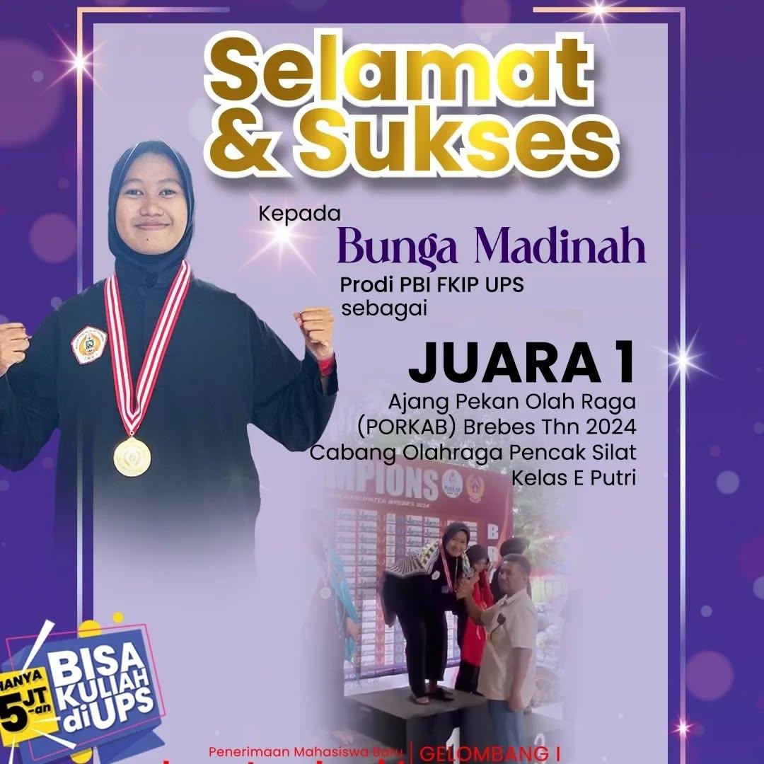 Bunga Madinah Raih Juara 1 Pencak Silat di PORKAB Brebes 2024 – Mahasiswi Universitas Pancasakti (UPS) Tegal, Bunga Madinah, berhasil meraih Juara 1 dalam cabang olahraga pencak silat pada ajang Pekan Olahraga Kabupaten (PORKAB) Brebes 2024.