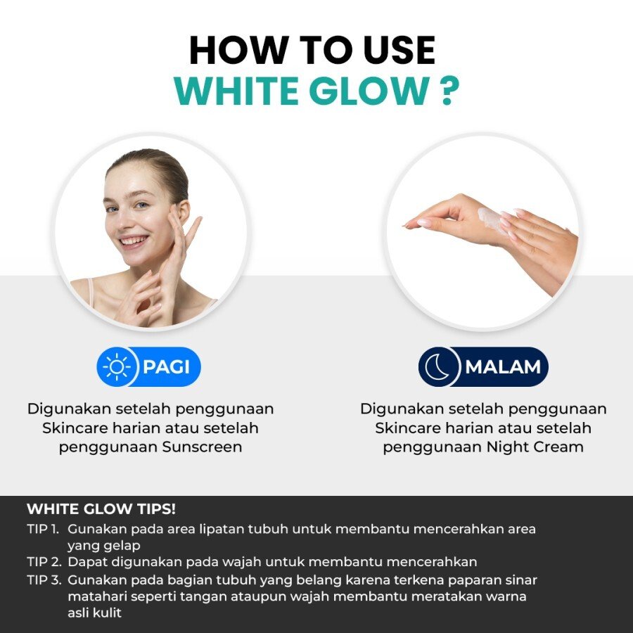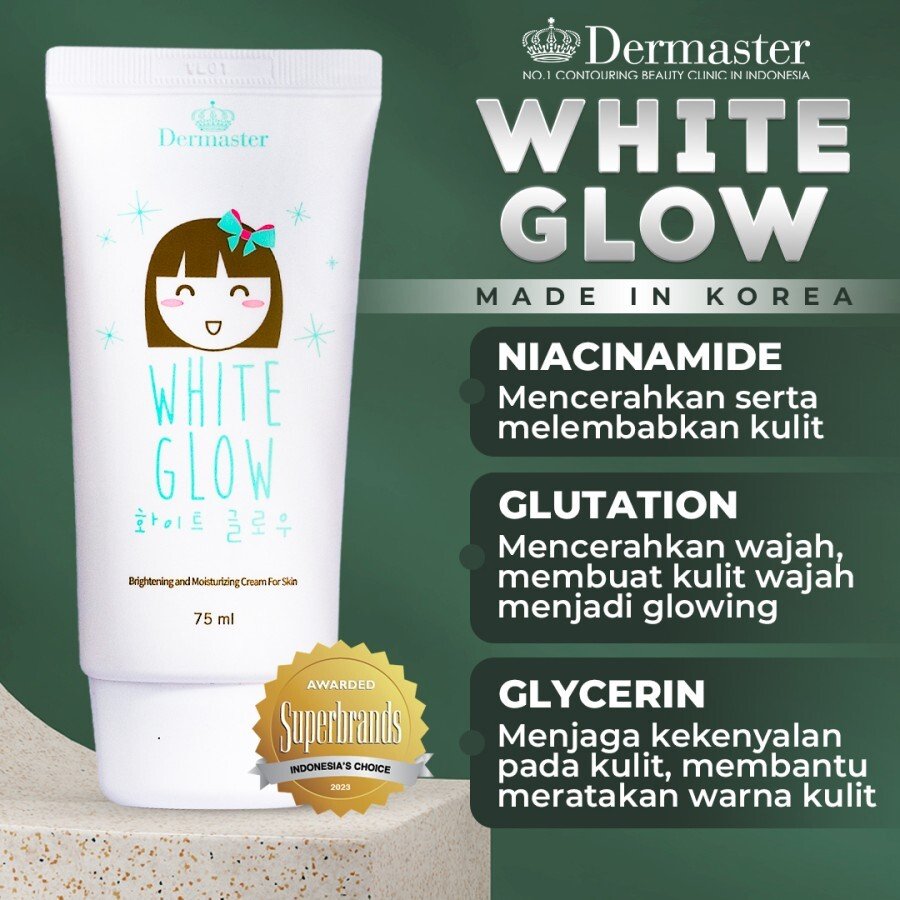 White Glow merupakan krim perawatan dari Dermaster Clinic yang mengandung Niacinamide untuk mencerahkan wajah, mengandung berbagai ekstrak bunga yang dapat membantu melembabkan dan menutrisi kulit. White Glow dapat menutupi area pada kulit yang gelap dan kusam serta meratakan warna kulit menjadi lebih cerah dan berkilau. White Glow bisa di pakai untuk wajah dan seluruh tubuh yang dibutuhkan.