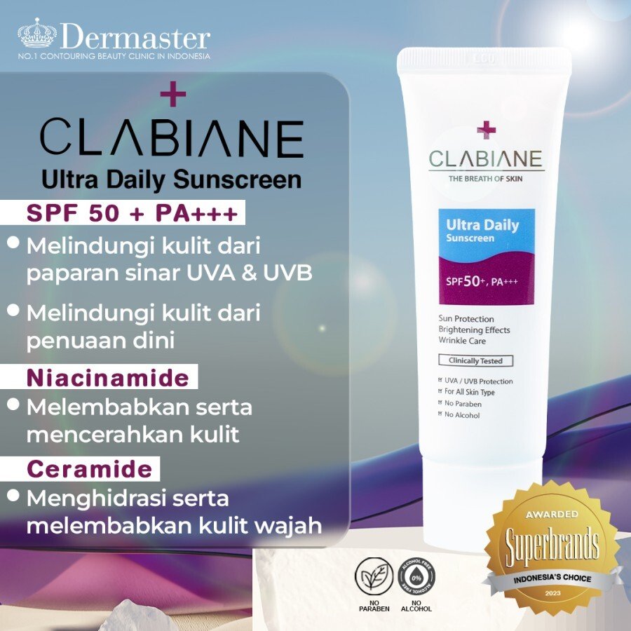 Clabiane Ultra Daily Sunscreen SPF 50 PA++ memblok 98% sinar UVB merupakan krim tabir surya dengan tekstur yang ringan, mudah meresap dikulit sehingga nyaman digunakan. Di formulasikan untuk melindungi kulit wajah dari paparan sinar UVA dan UVB. No paraben & alcohol.