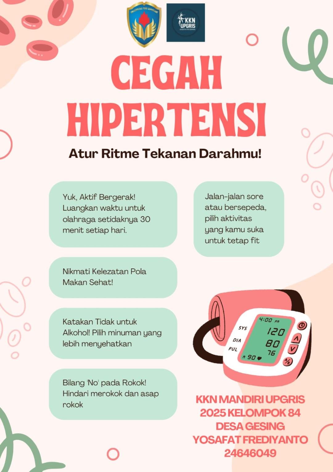 Kegiatan deteksi dini hipertensi ini diharapkan dapat memberikan kontribusi nyata dalam menurunkan angka hipertensi di Desa Gesing serta meningkatkan kesadaran masyarakat tentang pentingnya menjaga kesehatan jantung dan pembuluh darah. Kegiatan ini juga merupakan bagian dari upaya kampus untuk memberikan pengabdian kepada masyarakat melalui kegiatan KKN yang berbasis pada kebutuhan nyata di lapangan.
