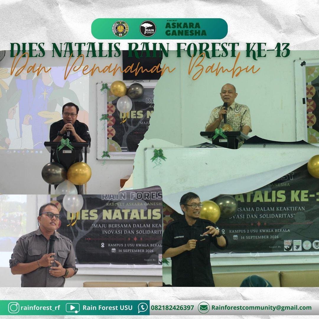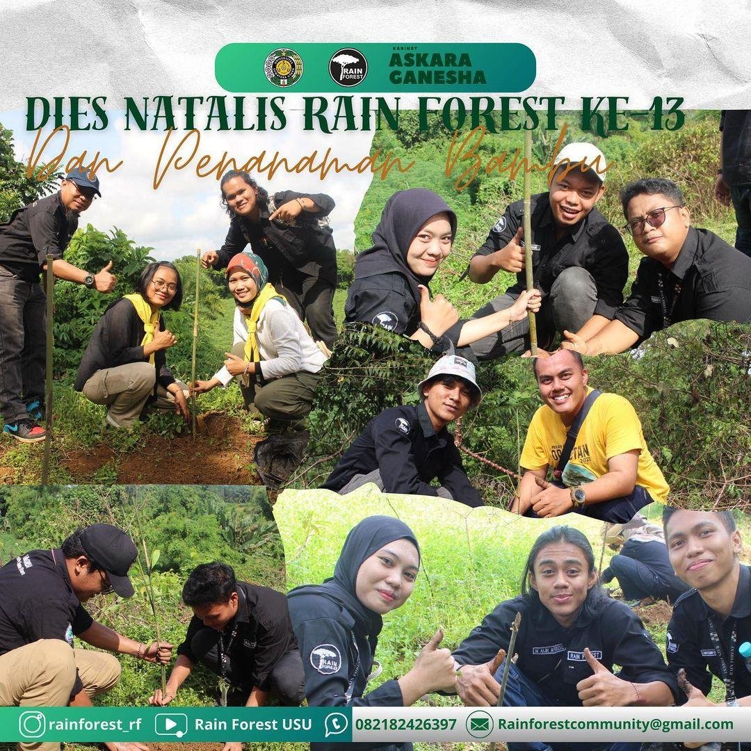 Kegiatan ini didukung oleh berbagai sponsor, meliputi PUI Bambu USU dan Patron Satwa Indonesia, di mana keduanya bergerak dalam mendukung upaya pelestarian lingkungan yang sejalan dengan moto Rain Forest. Kegiatan yang dihadiri oleh lebih dari 50 peserta ini dimulai dengan kata sambutan oleh Dekan Fakultas Kehutanan, Pembina Rain Forest, dan Ketua Umum Rain Forest. Selanjutnya, penanaman 100 bibit bambu dilakukan di sekitar kawasan Kampus 2 USU Bekala. Setelah penanaman bambu rampung dilaksanakan, kegiatan dilanjutkan dengan pemutaran video perjalanan UKM Rain Forest. Kemeriahan Dies Rain Forest kemudian dilanjutkan dengan acara talk show yang menghadirkan Rahman Abdel Rouf, S.Hut., atau biasa yang dipanggil Bang Abdel. Bang Abdel merupakan salah satu Alumni sekaligus perintis Rain Forest Gen-1 (Rimba Collective Project). Dalam talkshownya, Bang Abdel menyampaikan bahwa komunikasi lintas generasi adalah hal yang paling penting dan harus dipertahankan untuk kemajuan sebuah organisasi yang sehat. Setelah acara talk show selesai, pemotongan tumpeng dan foto bersama dilakukan sebagai penutup acara. Perayaan Dies Natalis UKM Rain Forest ke-13 ini tidak hanya menjadi momen bersejarah bagi anggota UKM, tetapi turut menjadi wadah dalam meningkatkan keaktifan, inovasi, semangat solidaritas, serta kekeluargaan yang dianut UKM Rain Forest yang dapat memberikan kontribusi nyata terhadap pelestarian alam. Selain itu, peringatan hari jadi Rain Forest kali ini juga diharapkan dapat mendorong semangat untuk meningkatkan aksi pro aktif berbagai organisasi penggiat lingkungan lainnya.