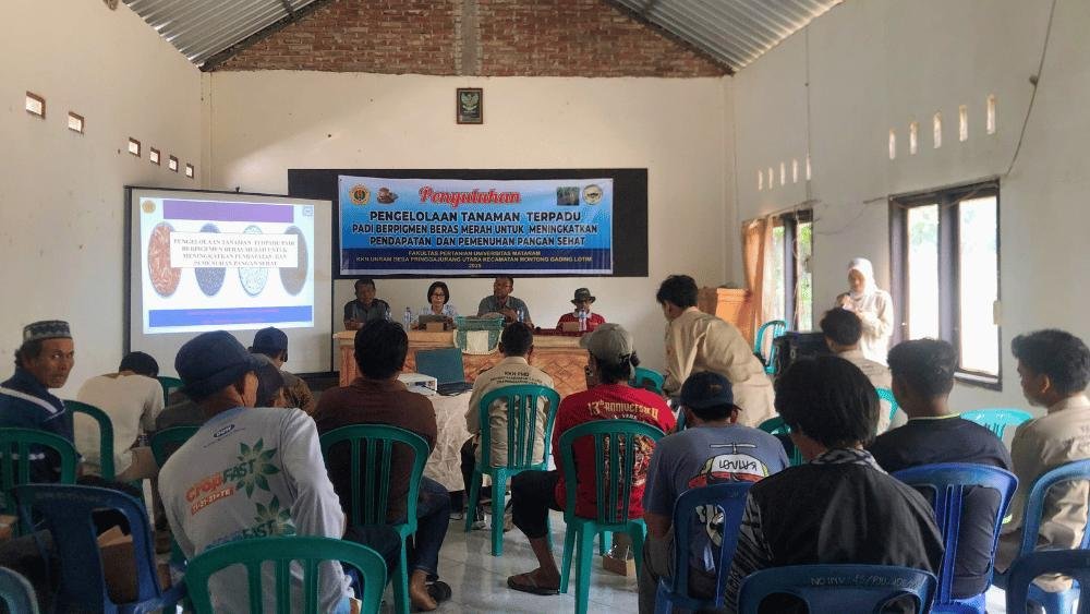 Pringgajurang Utara – Mahasiswa Kelompok Kuliah Kerja Nyata (KKN) Pemberdayaan Masyarakat Desa (PMD) Universitas Mataram sukses menggelar sosialisasi bertema “Pengelolaan Tanaman Terpadu Padi Berpigmen Beras Merah untuk Meningkatkan Pendapatan dan Pemenuhan Pangan Sehat”. Kegiatan ini bertujuan untuk memberikan pemahaman kepada masyarakat mengenai teknik budidaya padi beras merah yang lebih efisien dan bernilai ekonomi tinggi.