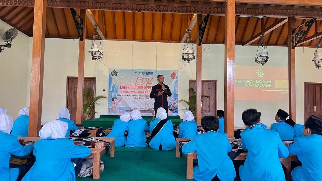 Bantul (MTsN 6 Bantul) – OSIM MTs Negeri 6 Bantul sukses menyelenggarakan Latihan Dasar Kepemimpinan. Dari beberapa pilihan materi yang disampaikan, materi Keorganisasian disampaikan oleh pengurus Kwarcab Bantul, Budi Priyono, Sabtu (1/2/2025) di Joglo Digdowiharjan. Wakil Ketua Kwarcab Bantul sekaligus guru di MAN 3 Bantul memulai materi dengan penjelasan asal mula istilah OSIM. “OSIM aslinya berasal dari kata OSIS. Karena di madrasah juga ada, namanya menjadi OSIM yaitu organisasi siswa intra madrasah,” tuturnya di awal pemaparan.