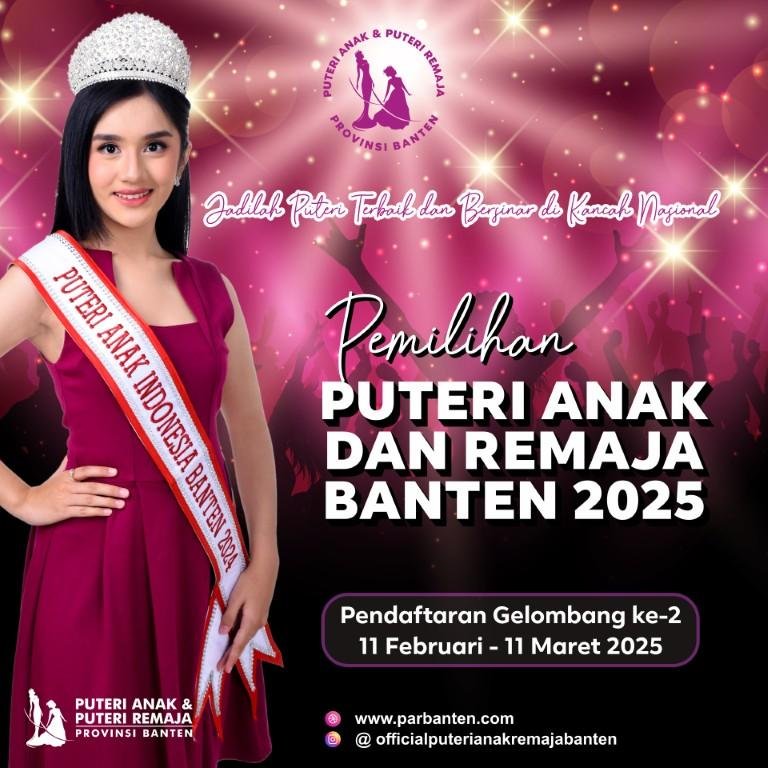 Ayo puteri terbaik dari Banten segera mendaftar di Ajang Puteri Anak dan Remaja Banten 2025, saatnya kamu menjadi Puteri Anak Remaja Banten 2025, dan menjadi Bintang Indonesia berprestasi!