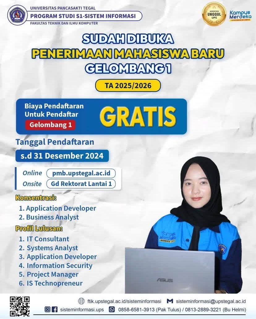 Universitas Pancasakti (UPS) Tegal membuka pendaftaran mahasiswa baru Program Studi S1 Sistem Informasi untuk Tahun Akademik 2025/2026.