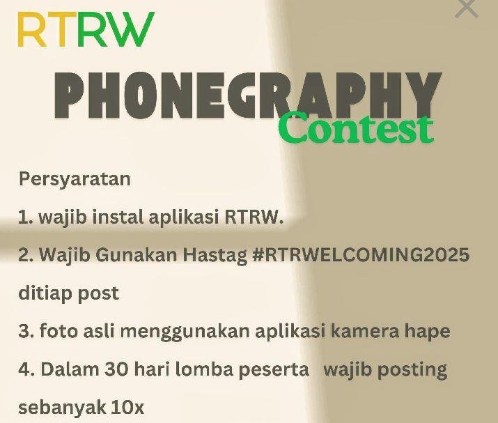 Untuk ikut lomba ini, kamu cukup download RTRW.App di Play Store atau App Store, lalu daftar dan login ke akunmu. Di dalam aplikasi, kamu akan menemukan fitur upload feed di mana kamu bisa langsung mengunggah foto terbaikmu. Jangan lupa tambahkan deskripsi singkat yang menggambarkan foto tersebut. Prosesnya mudah dan cepat, jadi nggak ada alasan buat nggak ikut. Yang penting, pastikan foto yang kamu kirimkan adalah karya orisinal dan tidak melanggar norma atau hukum. Jangan lupa sertakan hastag #rtrwelcoming2025