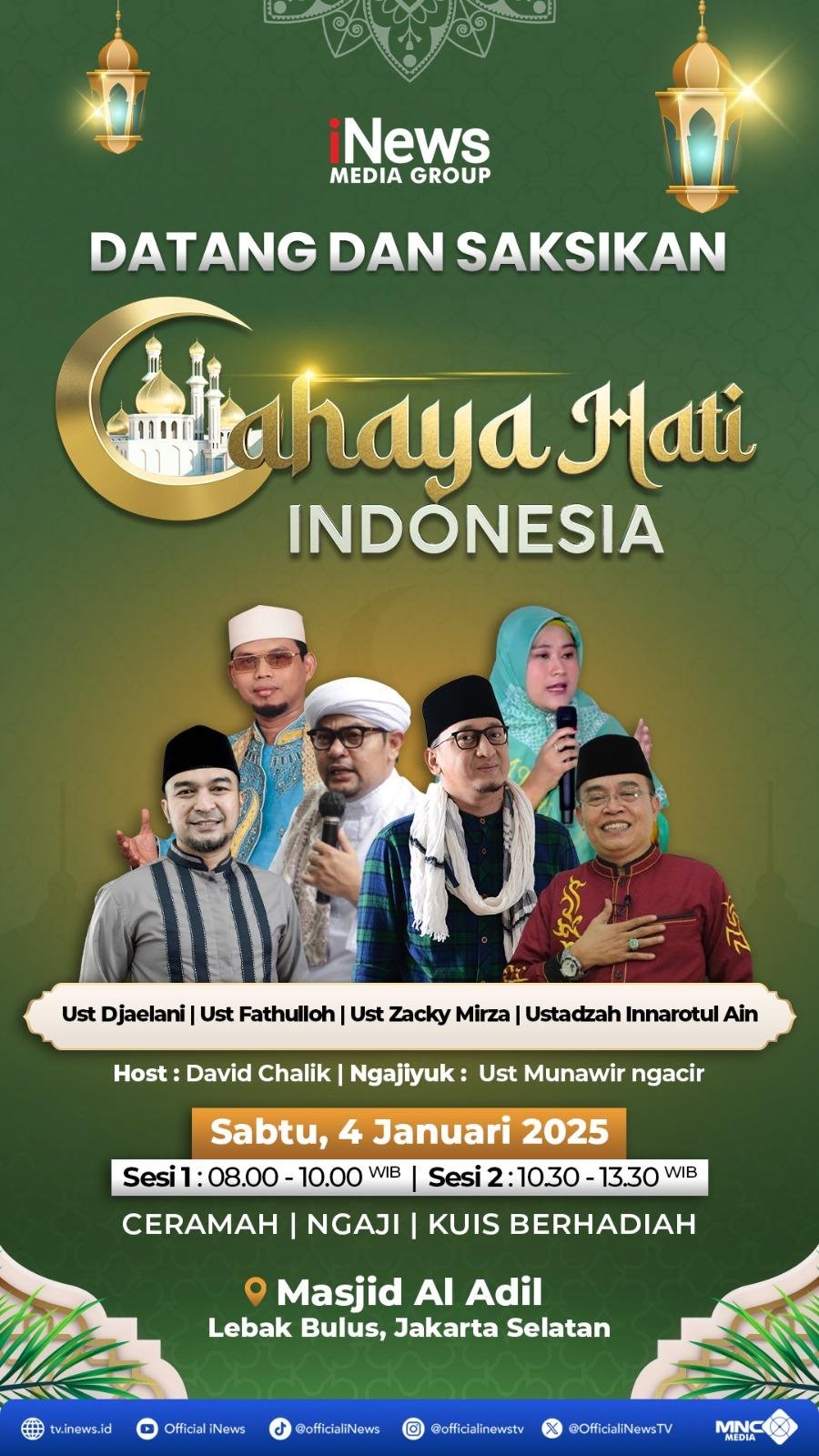 Jakarta – Suasana khusyuk dan penuh hikmah menyelimuti Masjid Al Adil, Lebak Bulus, Jakarta Selatan, saat acara Cahaya Hati Indonesia digelar pada Sabtu ini. Program yang diinisiasi oleh iNews Media Group ini berhasil memikat perhatian masyarakat dengan konsep dakwah inspiratif yang memberikan banyak manfaat bagi umat Islam.